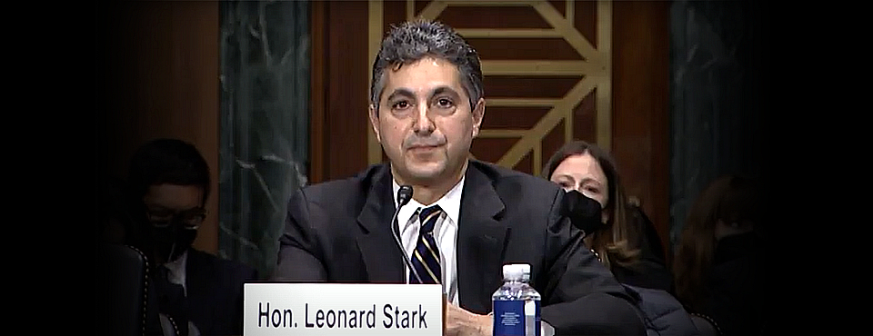 (Below) Judge Leonard P. Stark at his Senate confirmation hearing to be a Federal Circuit judge on Dec. 01, 2021. The weight of his misconduct in Leader v. Facebook and Lakshmi Arunachalum cases, among others, are hanging heavy on his corrupt bloated countenance. Confession is good for the soul Judge Stark; karma is a beach. Your British Pilgrims Society handlers can no longer hide.